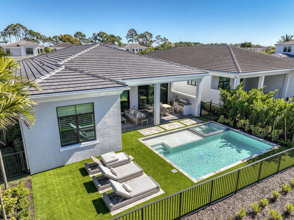 Welcome to this exquisite new construction residence in the gated community of Artistry in Palm Beach Gardens, where modern design and elevated finishes converge in a thoughtfully curated one-story floor plan. Offering 3 bedrooms, 3.5 baths, a private office, and a 3-car garage across 2,976 square feet under air, this home was crafted for both refined living and effortless entertaining. A seamless open layout unites the living, dining, and kitchen spaces, truly the heart of the home, accentuated by large-format tile flooring, custom lighting, 5'' baseboards, and a sophisticated linen-toned palette. The designer kitchen showcases custom white wood cabinetry, coordinating quartz countertops and backsplash, a premium stainless steel appliance package with gas cooktop, separate beverage refrigerator, and an expansive island with pull-up seating. Two oversized 10' sliding glass doors flood the space with natural light while framing views of the covered patio and resort-style pool and spa. The dedicated office, introduced by double doors and a recessed ceiling detail, provides a quiet and stylish workspace. All bedrooms feature en-suite baths and walk-in closets, with the primary suite serving as a true sanctuary. Its spa-inspired bath is appointed with a wall-to-wall dual vanity with center make-up station, floor-to-ceiling tile, soaking tub, glass-enclosed shower, bronze fixtures, and statement lighting. Outdoor living is equally compelling, highlighted by an expansive covered patio designed for year-round enjoyment. A fully equipped summer kitchen with built-in grill anchors the dining area, while the lounge space is prepped for a wall-mounted TV. The sparkling pool and integrated spa with sunshelf are surrounded by turf greenery and lush tropical landscaping, creating a private resort ambiance. Additional features include impact windows and doors, white plantation shutters, and a dedicated laundry room with sink and added storage. This exceptional residence offers the perfect blend of new construction peace of mind and sophisticated modern luxury in one of Palm Beach Gardens' most sought-after gated communities.