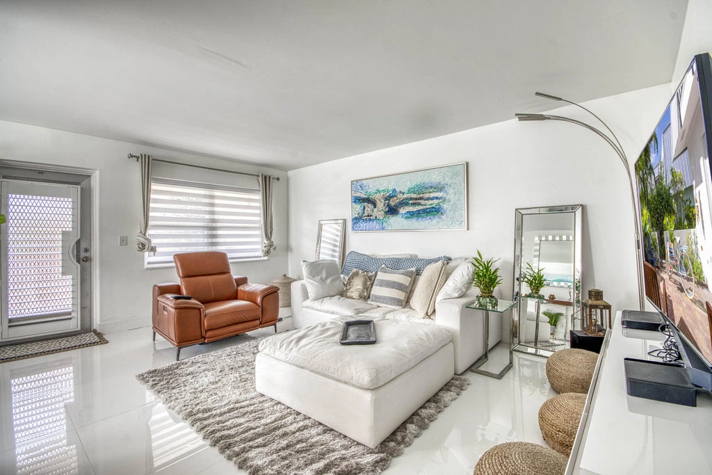 Modern tile floors flow seamlessly through the living spaces, bedrooms, and primary bath. The main living area connects to the dining space with zebra shades and an updated kitchen featuring blue painted wood cabinetry, quartz countertops, stainless steel appliances, and a window. The rear of the condo includes two bedrooms and 1.5 baths. The primary suite offers sliding glass doors to the screened balcony and a walk-in closet with motion-sensor lighting. The updated bathroom includes a glass shower door, vanity, modern lighting, and contemporary finishes. The guest bedroom mirrored closet doors and a window overlooking the balcony and water. The screened balcony spans the full width of the condo, with water views and added privacy due to the corner position.