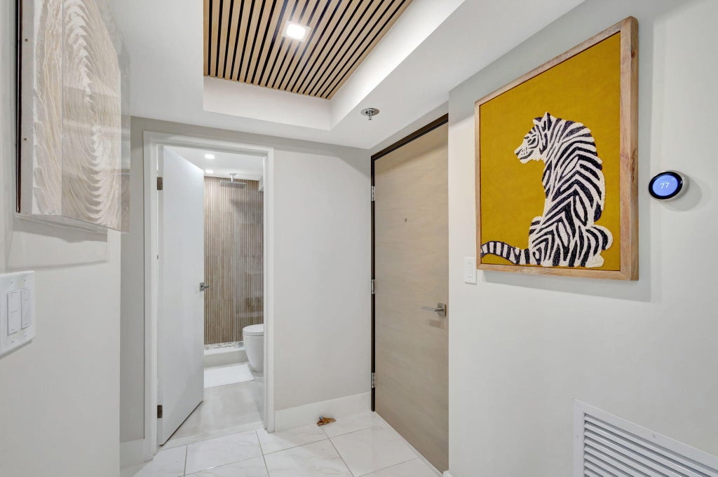 Impressively updated condo on Singer Island with intracoastal and ocean views. Large wrap around balcony and private balconies for both bedrooms with water views. Covered garage parking. Kitchen has high-end modern cabinetry, subZero and Monogram stainless steel appliances, coffee bar, wine fridge, beverage cooler, garbage pullout, and gorgeous quartz counters. Tile floor throughout. Flat ceiling (no popcorn). LED lighting. Electric blinds in the living room and bedrooms. All impact windows. Smart tech features. Enjoy peace & quite, a walk on the beach, a swim in the pool, tennis, and the many nearby restaurants & shops on Singer Island, Palm Beach Gardens, North Palm, & Jupiter. Steamer/dry cleaner in master closet. 4 condos share full sized washer/dryer. Dream condo. Dream life.