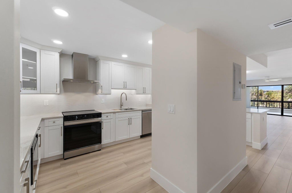 Reconstructed, turn-key opportunity awaits by thoughtful design in this layout improved upon from the original floor plan, overlooking the North Palm Beach Marina and across the street from the North Palm Beach Country Club! Upon entry, a newly created private laundry room features a full-size washer and dryer. Newly expanded and reconfigured kitchen features white shaker cabinetry with crown molding, undermount lighting, Quartz counters, tile backslash, power drawer in-cabinet microwave, stainless-steel appliances, pantry, wine cooler, sink with cutting board, and bar seating. Entertain in the dining or living room areas, with extra corner-unit windows, overlooking the marina and leading to the expansive screened-in patio with new large-format tile and private storage closet. Retreatto the Primary suite with entry to the patio, completely remodeled Primary bath with dual-sink vanity, LED mirror, frameless glass tile and stone shower, and walk-in closet. Second bedroom with walk-in closet is served by a remodeled bathroom with new vanity, LED mirror, and frameless glass and stone shower. Relax on the covered, screened-in patio overlooking the green space and boats at the North Palm Beach Marina. Assigned covered parking spot in front of the building. Upgrades abound: new flooring, new cabinetry, new countertops, new appliances, new paint, new LED lighting, new fans, and more. Marina Bay is mere steps from the North Palm Beach Country Club, outdoor dining with live entertainment at Belle's Food Truck at the North Palm Beach Marina, and has completed the required condominium inspections.