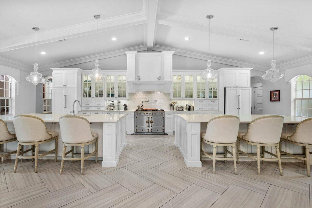 Situated on over one acre of land, this renovated and charming one- story home offers you phenomenal views with nearly 190 feet on the largest lake in Steeplechase!Featuring a modern open plan with traditional and modern details and classical finishes including a french style garden, brick paved circular driveway & boasting a stunning cathedral ceiling with beams and crown moldings as well as impact glass doors and windows and a newer roof.Once you walk through the double iron doors and just past the main living areas an outstanding custom built white kitchen is showcased with an abundance of upper glass cabinetry, an 11' high custom hood, white quartz counters and 2 large islands of 5'x9' each. The focal point of this gorgeous kitchen is a ''La Cornue'' stainless-steel/chrome/brass range with a gas cooktop and 2 electric convention ovens. The primary bedroom boasts a sitting area overlooking the lake, french doors allowing for direct access to the pool, 2 large walk-in closets, a make-up area and a gorgeous ensuite primary bathroom highlighting a free standing double ended cast iron tub with a view of a landscaped private garden, a seamless glass shower and separate custom vanities. On the opposite side of home you will find 3 spacious bedrooms, 2 new full bathrooms, a laundry room with custom built-ins and a 3 car garage. Tucked away in a private spot in the beautiful backyard is a lovely guest house with a full bathroom with custom vanity and 2 separate rooms with french doors opening to a deck overlooking the garden and the lake. Steeplechase is lined with beautiful oak trees and sidewalks, all homes in the community are on an acre or more with room for tennis / pickleball courts, sport courts, putting greens & more! The community is centrally located w/in Palm Beach Gardens and includes a front and back gate as well as 24 hour roaming security. Less than 15 minutes to the Gardens Mall & area restaurants, 20 minutes from the PBI airport or Jupiter, 15 minutes from West Palm Beach and 25 minutes from the island of Palm Beach.