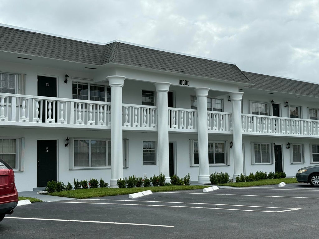 Move right into this beautifully updated 2-bedroom, 1.5-bath second-floor unit in a friendly 55+ community. The home features fresh paint throughout, hurricane panels for peace of mind, and a convenient exterior storage room.Enjoy resort-style amenities including a community pool, shuffleboard courts, and a clubhouse with a library and internet access. Located just steps from Publix and the surrounding shopping plaza, everything you need is within walking distance.Monthly assessments cover water, sewer, cable, and internet. Rental restrictions apply.